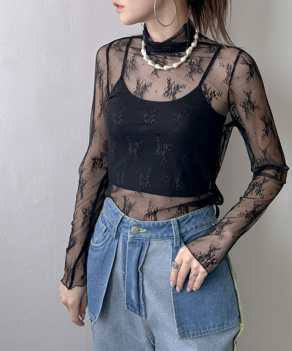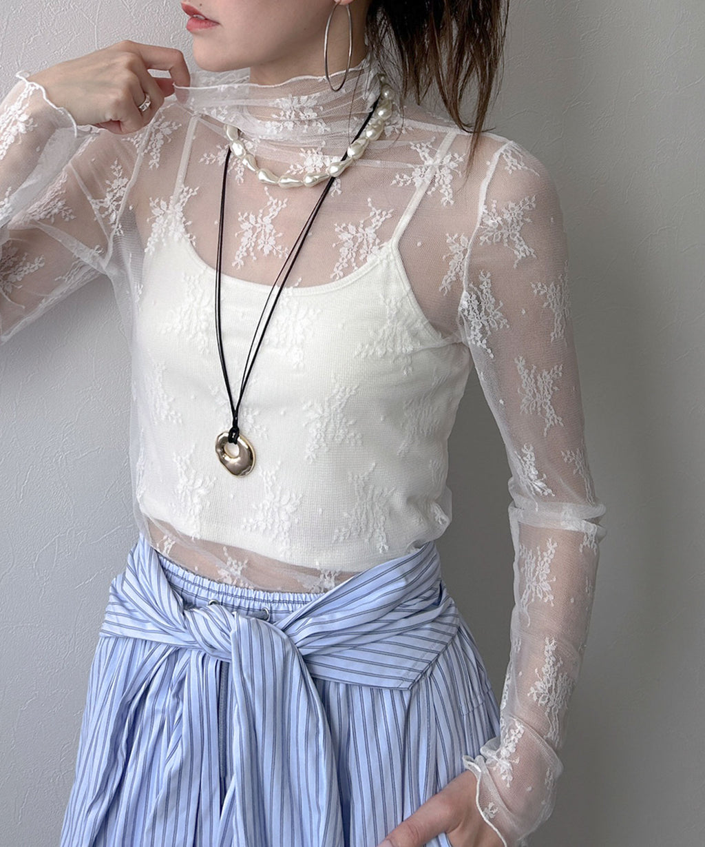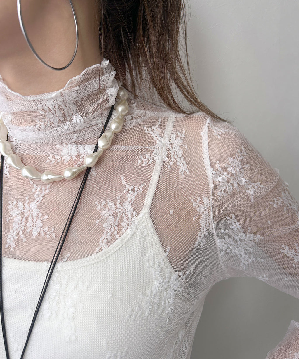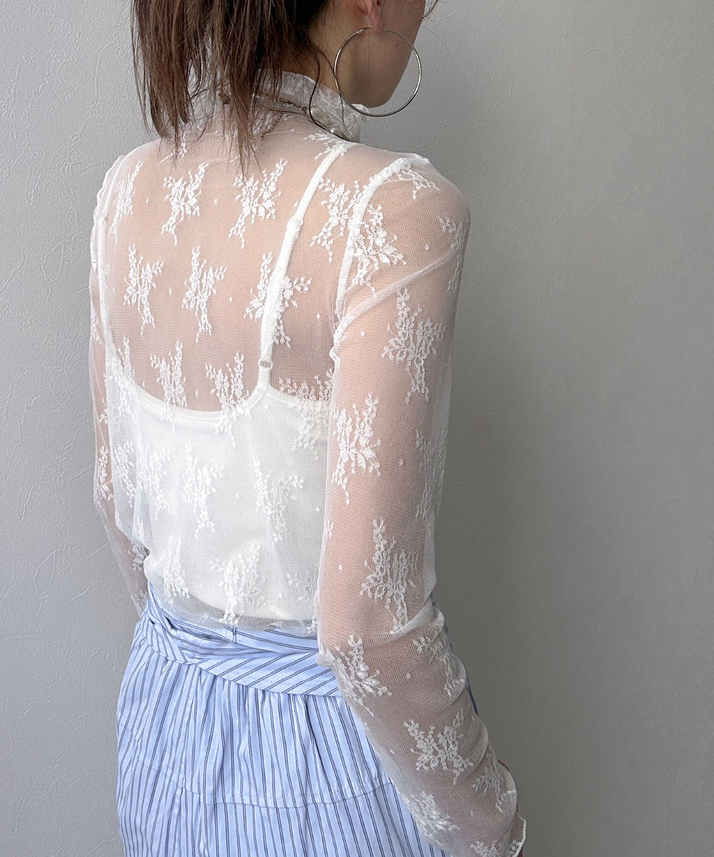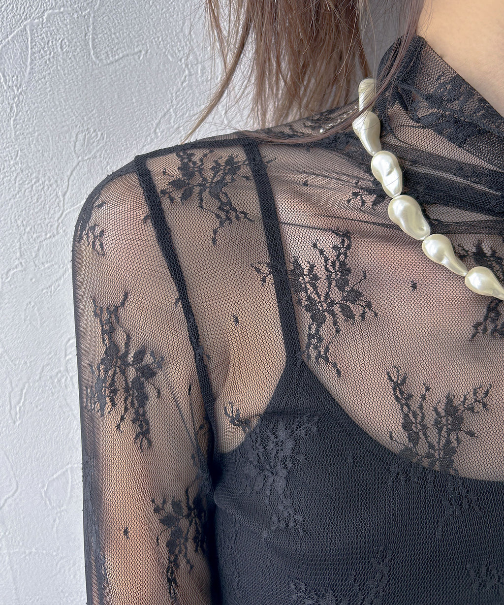 繊細なフラワーレースが目を惹くシアーハイネックトップス。