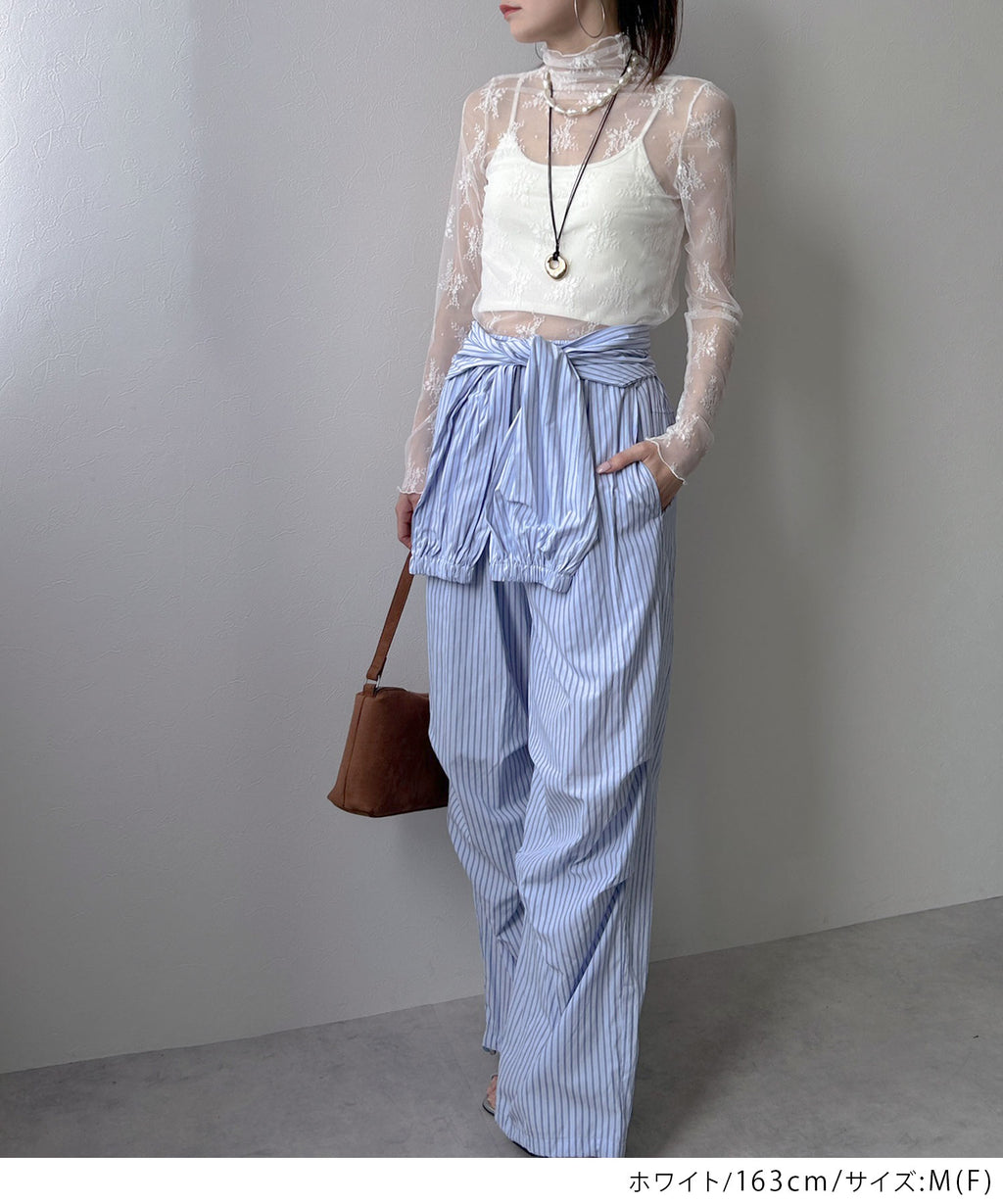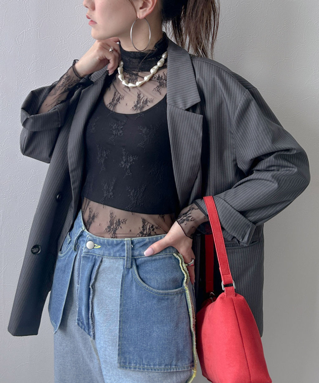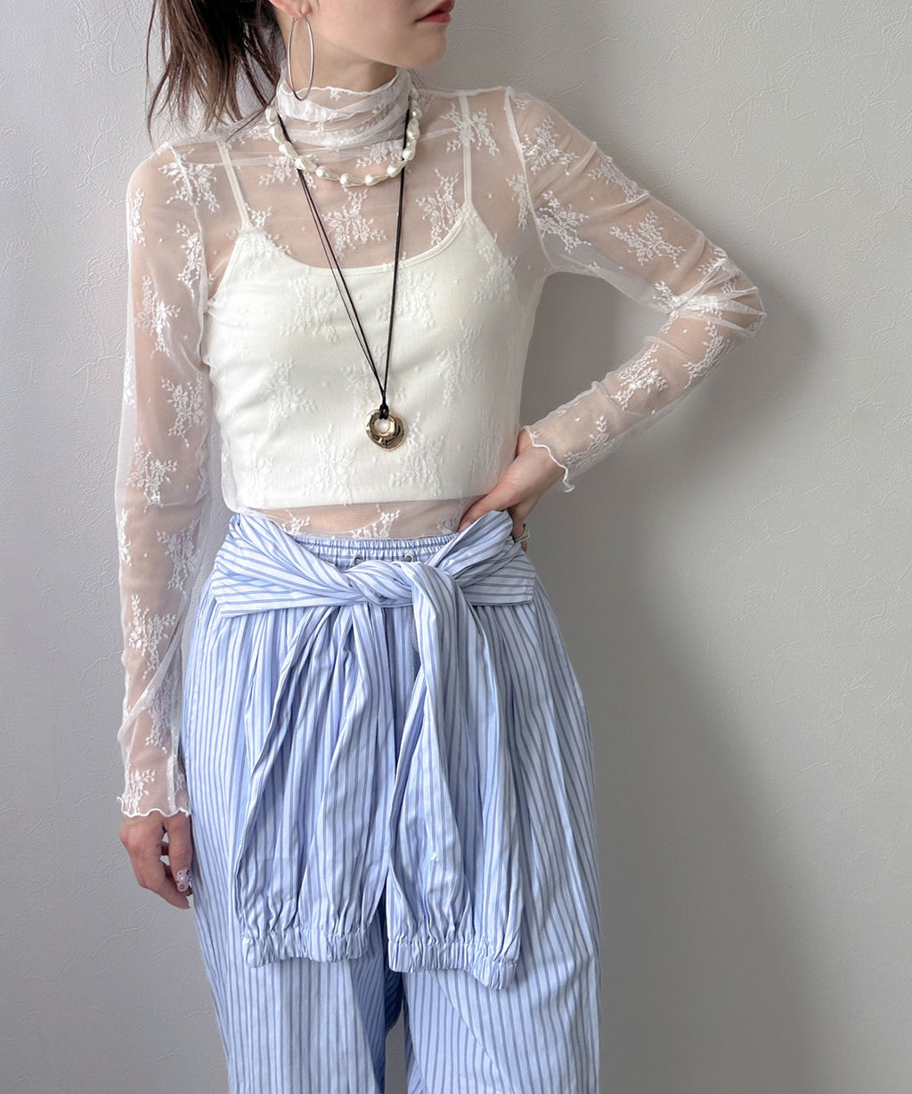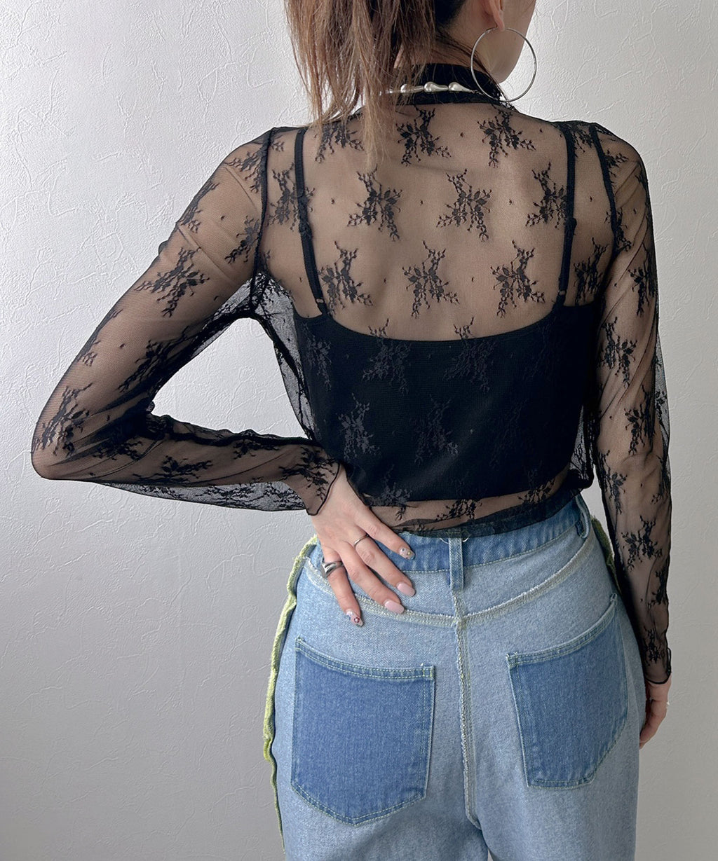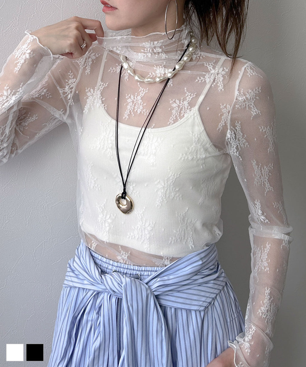繊細なフラワーレースが目を惹くシアーハイネックトップス。