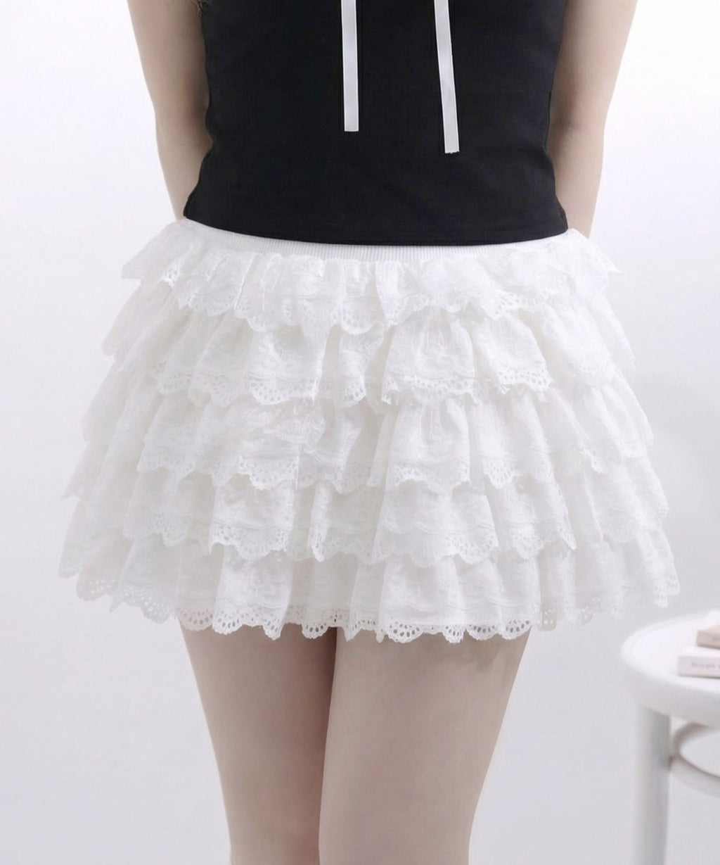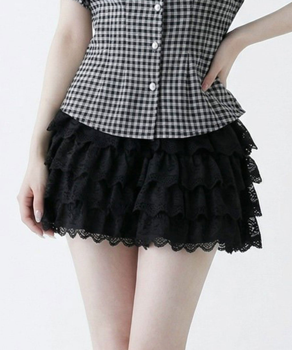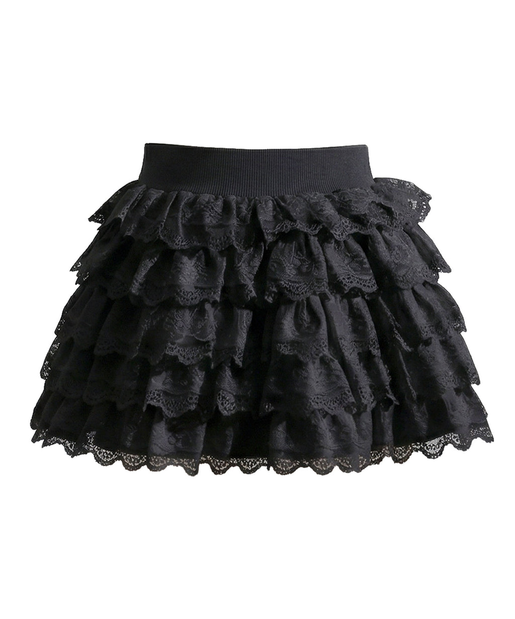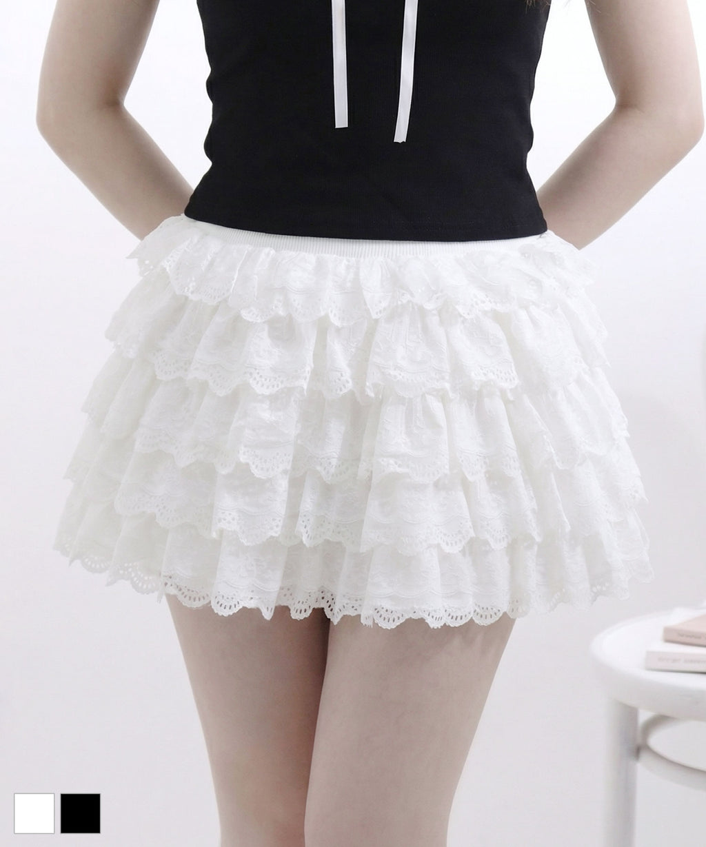 贅沢に重ねた5段のレースフリルが、歩くたびにふわふわと揺れる主役級のミニスカート。