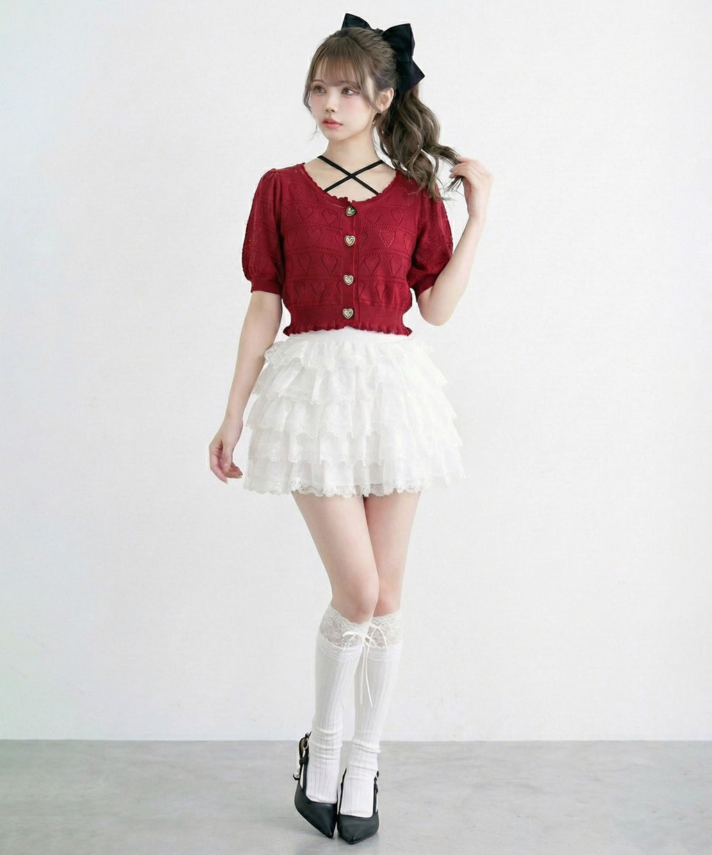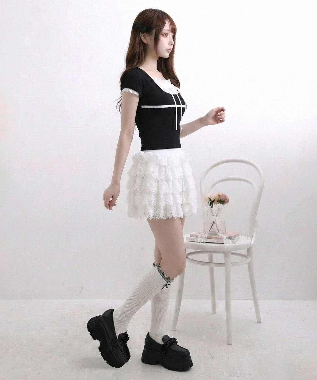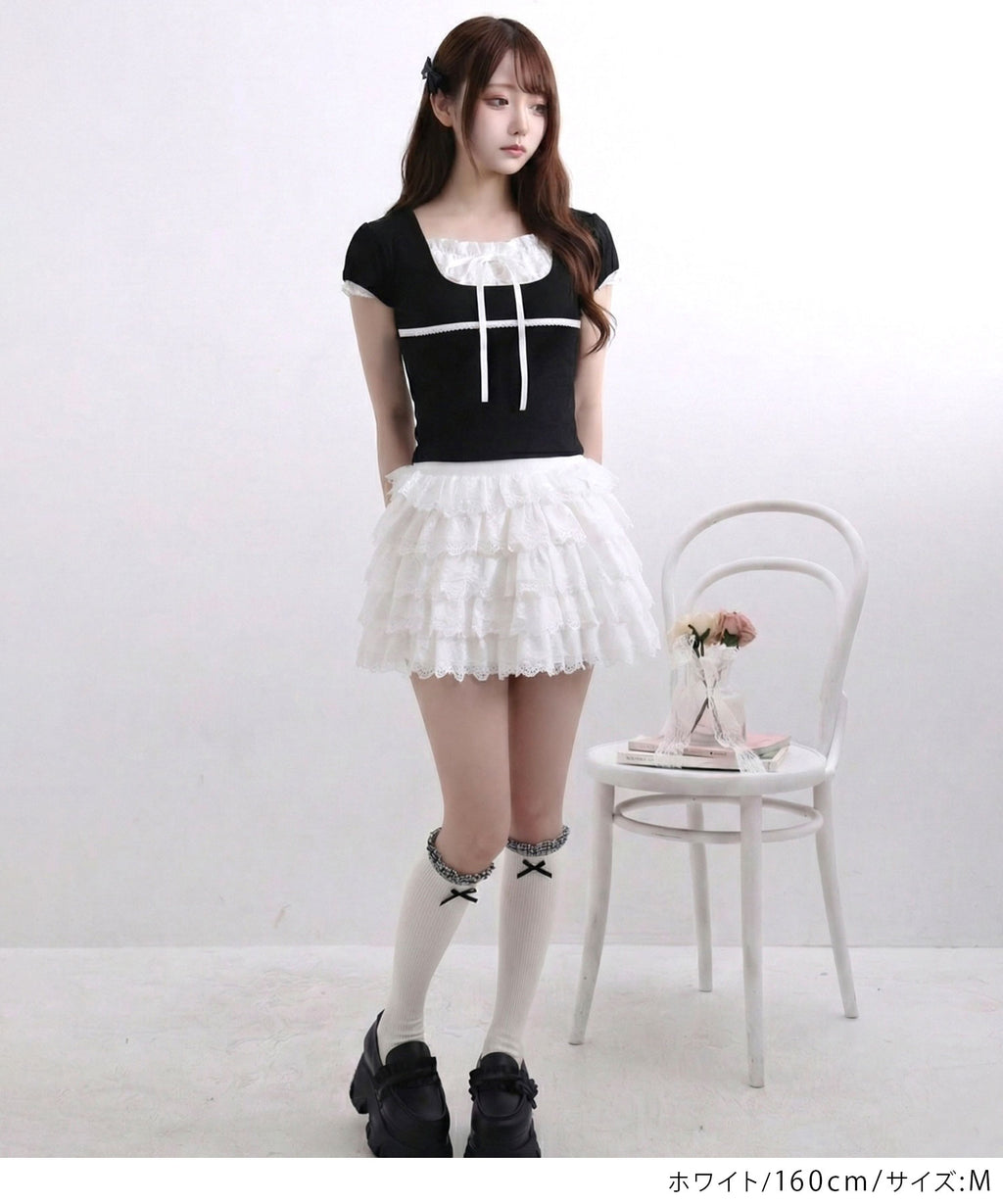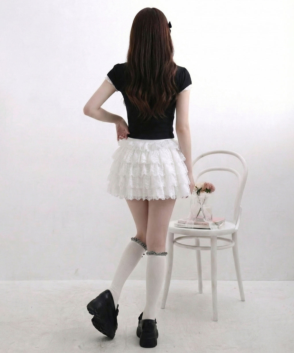 贅沢に重ねた5段のレースフリルが、歩くたびにふわふわと揺れる主役級のミニスカート。