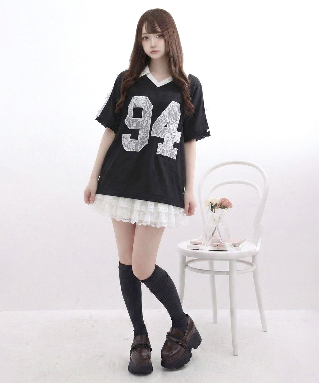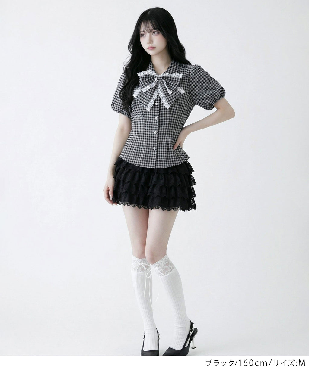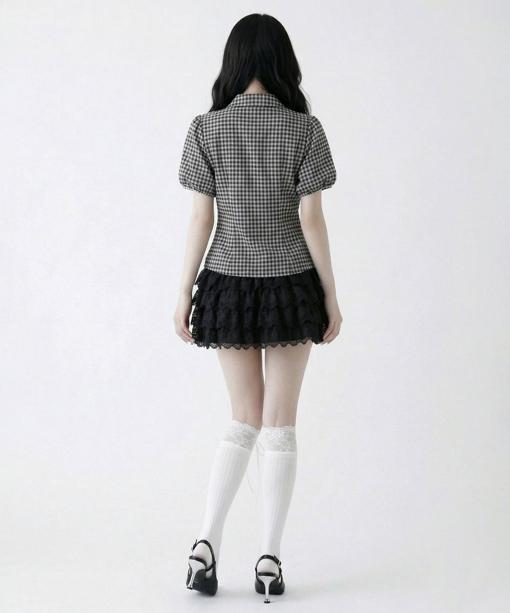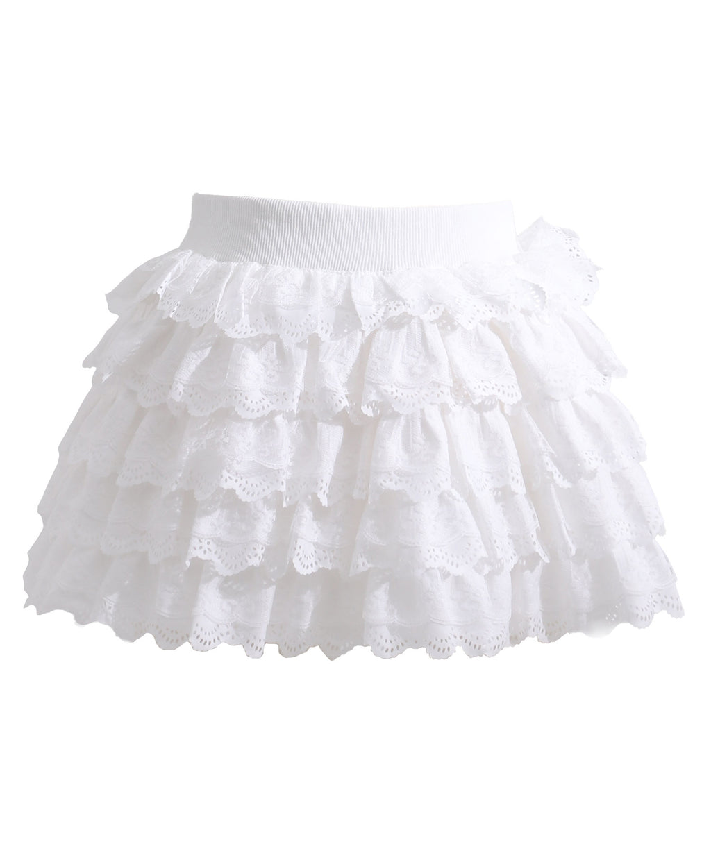 贅沢に重ねた5段のレースフリルが、歩くたびにふわふわと揺れる主役級のミニスカート。