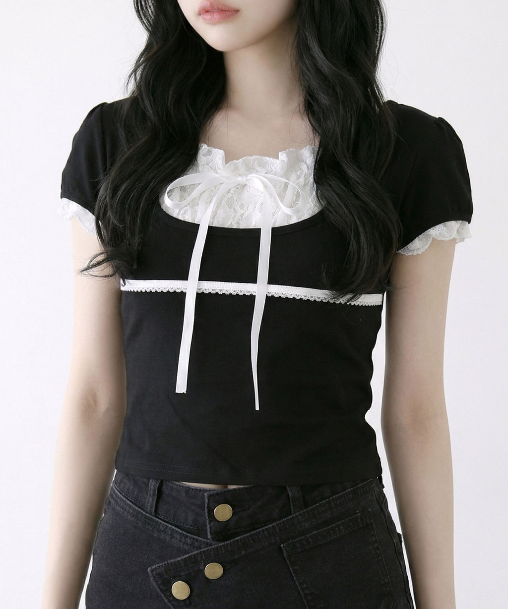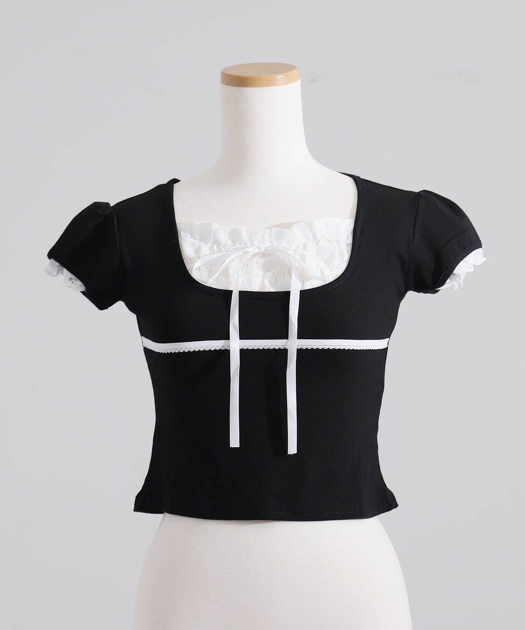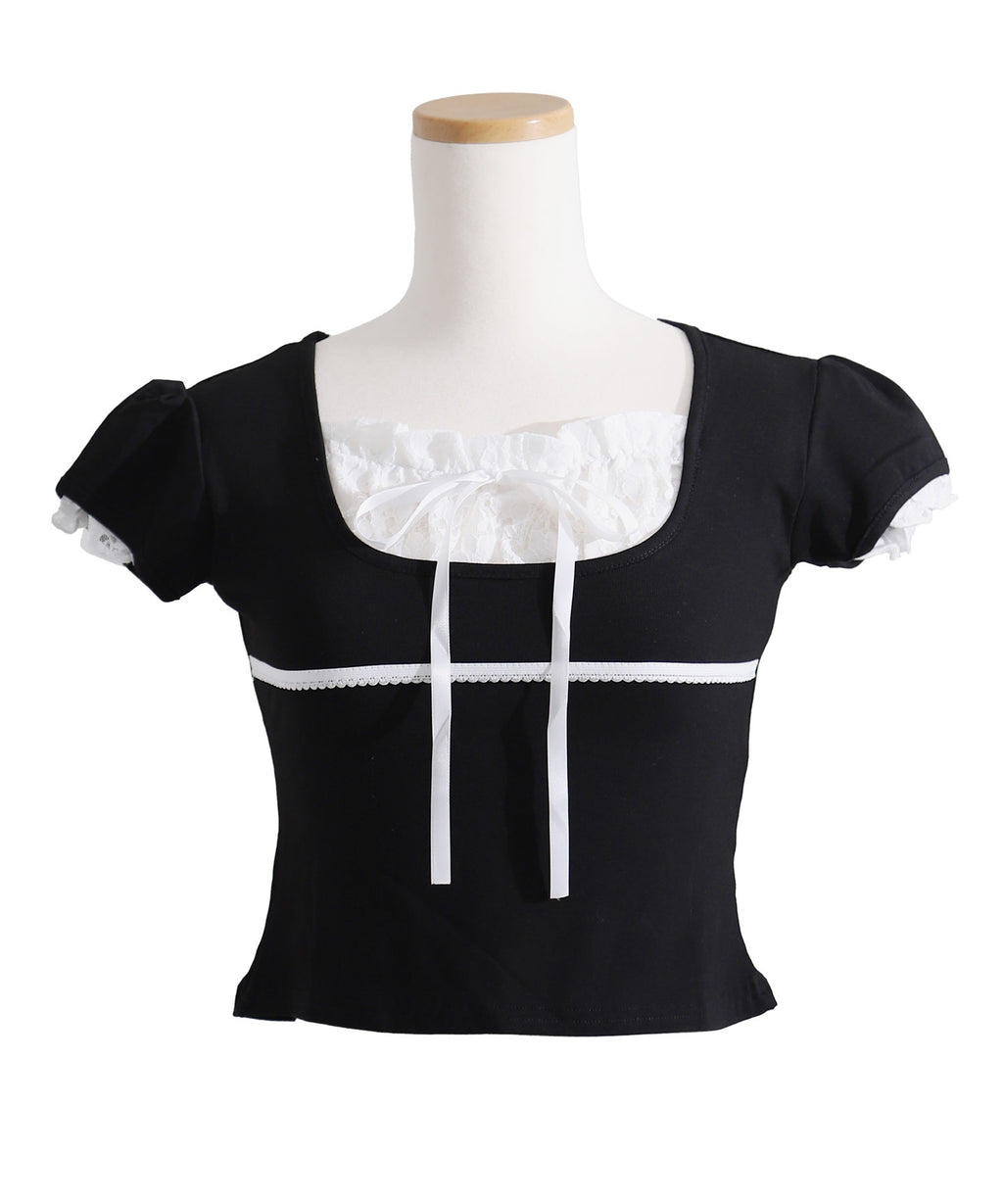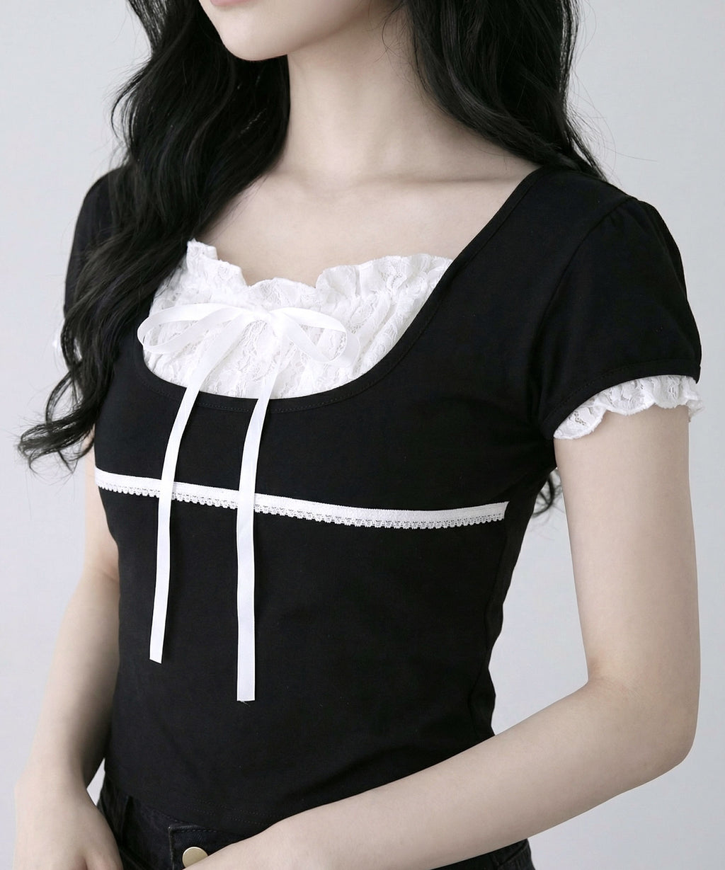 胸元ヨークのレース切り替えと、フロントの華奢なリボンが目を惹くガーリーなトップス。