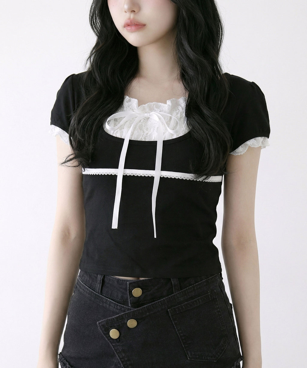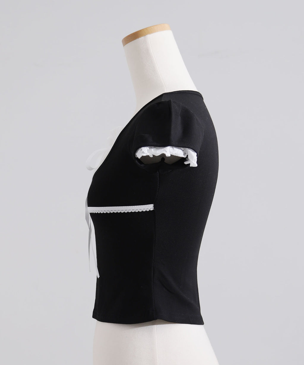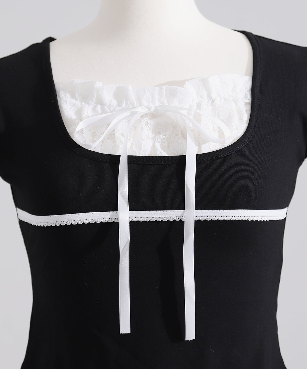 胸元ヨークのレース切り替えと、フロントの華奢なリボンが目を惹くガーリーなトップス。