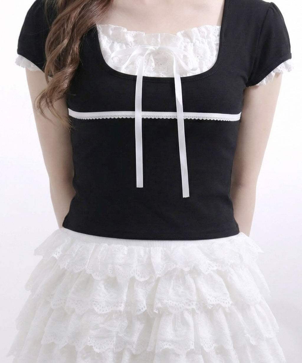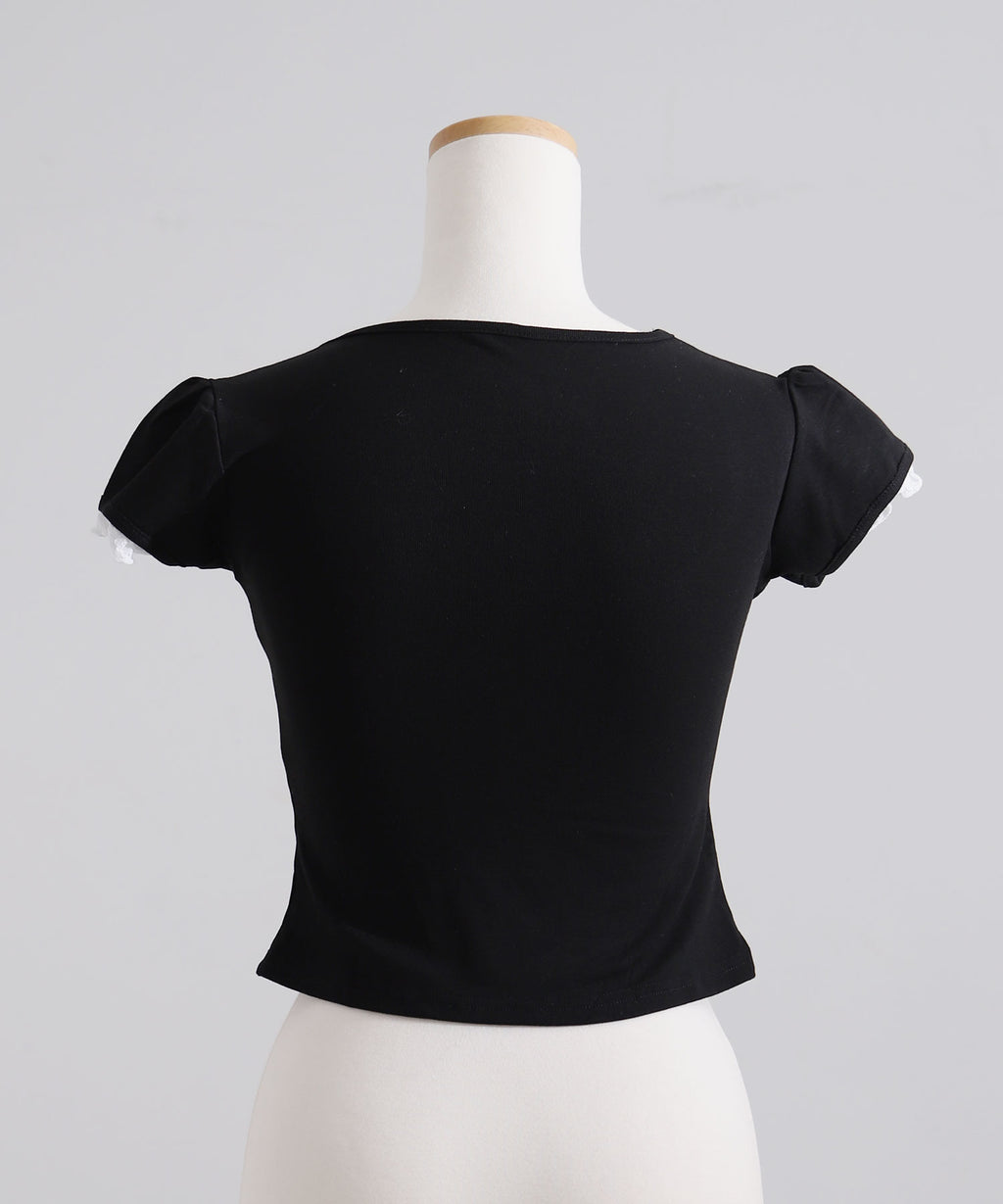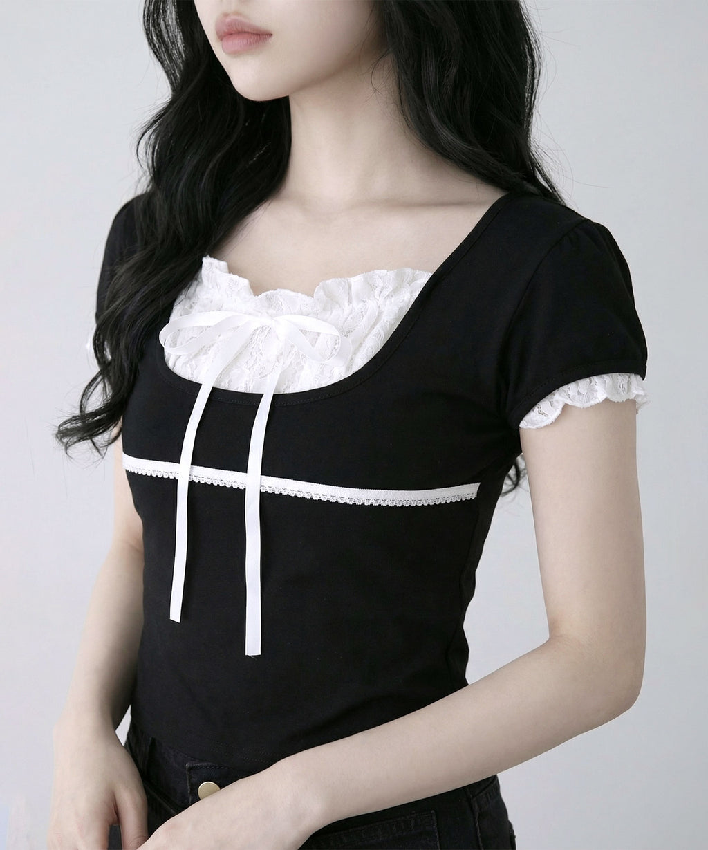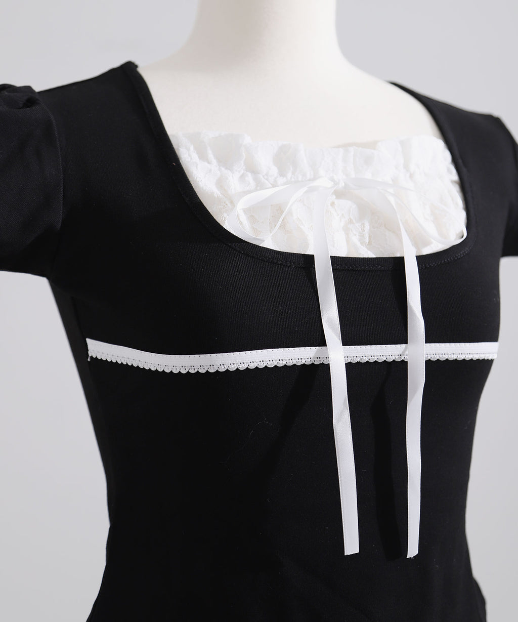 胸元ヨークのレース切り替えと、フロントの華奢なリボンが目を惹くガーリーなトップス。