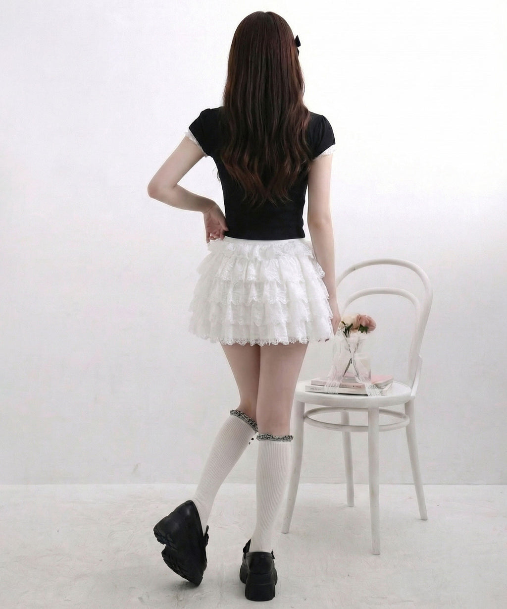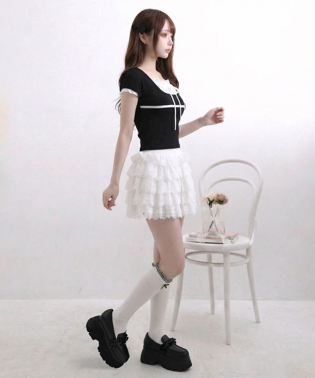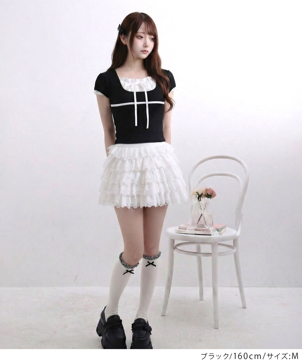 ボリュームのあるフリルミニスカートと合わせれば、メリハリのある王道フレンチガーリーorバレエコアスタイルに!